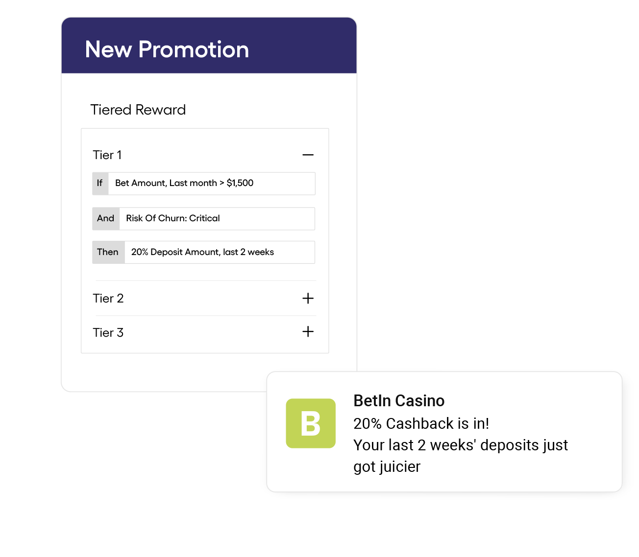 Set up smart rewards based on real behavior, like deposit size and betting frequency, without requiring help from data teams.