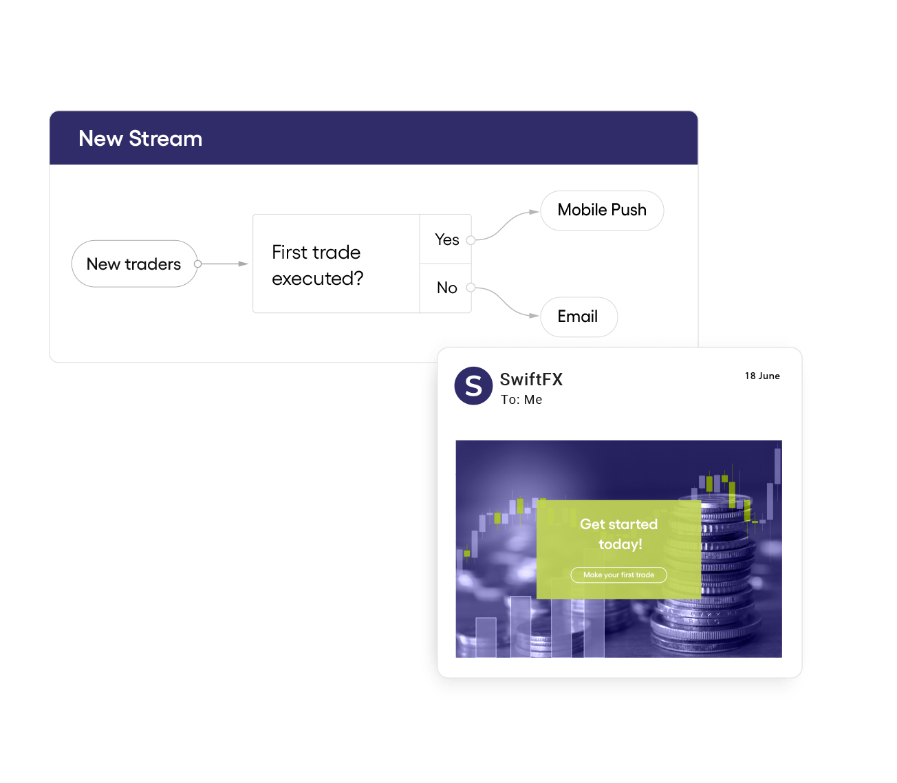 Capture every trading opportunity with real-time marketing that doesn’t wait on analysts or dev teams to adapt to trader behavior, market events, and global scale