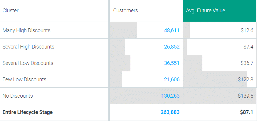 For example, divide your customers into clusters based on their discount affinity, as seen below. In this case, customers who received no discount or very low discounts have a higher future value than those receiving heavy discounts. Therefore, to increase the customer's future value, you can encourage customers who've purchased with heavy discounts to do so with lower discounts or full price.