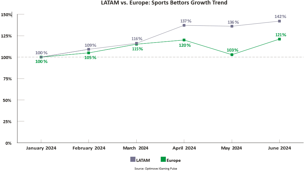 Aunque crece más lentamente en general, el maduro mercado europeo sigue atrayendo a un número significativo de nuevos jugadores debido a su infraestructura consolidada y a la gran popularidad de las apuestas de fútbol. Latinoamérica mostró una tasa más alta en abril y mayo (137 % y 139 %, respectivamente), lo que sugiere que los nuevos jugadores de Latinoamérica se unieron a la acción antes que los nuevos jugadores europeos, que se unieron cuando comenzó la Eurocopa 2024.