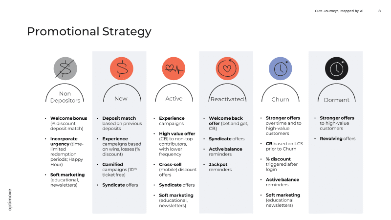 El marketing de relaciones con los clientes para loterías puede parecer intimidante, pero vamos a desglosarlo. Por supuesto, las estrategias promocionales recomendadas cambian en función de la etapa del ciclo de vida del jugador (LCS). Como se muestra en el gráfico siguiente, aunque prevalece el sentido común (por ejemplo, no enviar un bono de bienvenida a un jugador reactivado), los matices de los mensajes sí importan. Los no depositantes, por ejemplo, deben recibir un bono de bienvenida con períodos de canje limitados en el tiempo y beneficiarse de mensajes educativos sobre la lotería. Por el contrario, un jugador reactivado puede ser atraído con una oferta de bienvenida y recordatorios activos sobre el saldo y el bote.