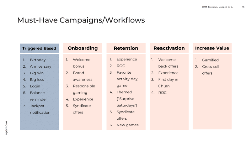El siguiente gráfico muestra los flujos de trabajo por categoría. Por ejemplo, los flujos de trabajo de campañas basadas en desencadenantes incluyen cumpleaños, aniversarios, grandes ganancias, grandes pérdidas, inicio de sesión, recordatorio de saldo y notificación de botes. O bien, los flujos de trabajo de incorporación pueden incluir bonos de bienvenida, conciencia de marca, juego responsable, experiencia del jugador u ofertas de sindicatos.