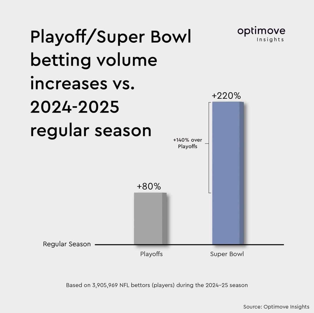 El informe de Optimove sobre las tendencias de apuestas de la NFL para 2024-2025 destaca un aumento del 220 % en los apostantes de la Super Bowl en comparación con los partidos de la temporada regular, con aumentos significativos en las apuestas simples y previas al partido.
