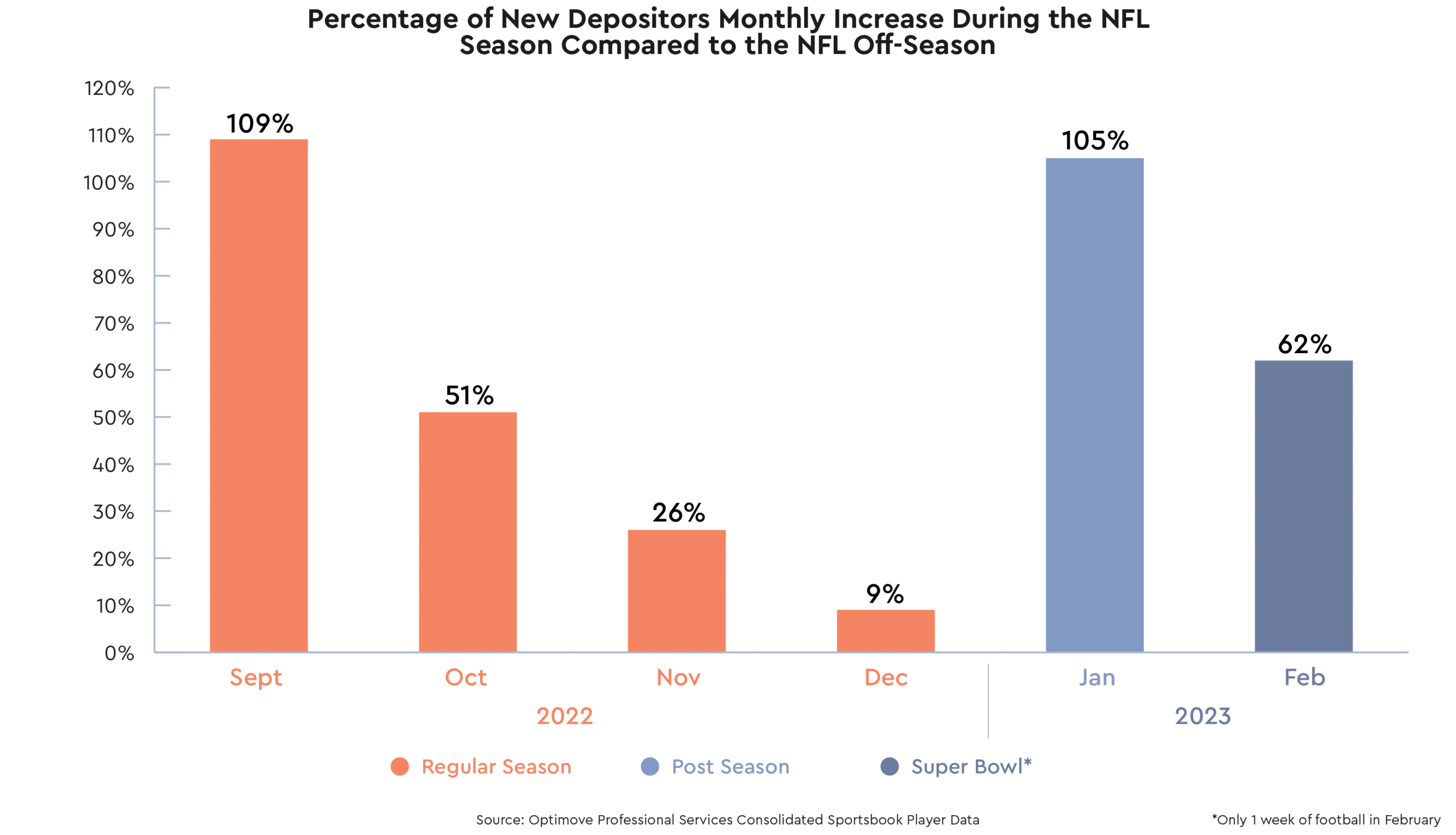 Como todos los grandes eventos deportivos, la NFL atrae a muchos nuevos depositantes (jugadores), personas que ingresan una cantidad inicial de dinero en una cuenta. A lo largo de la temporada de la NFL, observamos un aumento en el promedio mensual de nuevos depositantes en comparación con el promedio de los seis meses anteriores sin fútbol americano. (Porcentaje de aumento mensual de nuevos depositantes durante la temporada de la NFL en comparación con la temporada baja de la NFL).