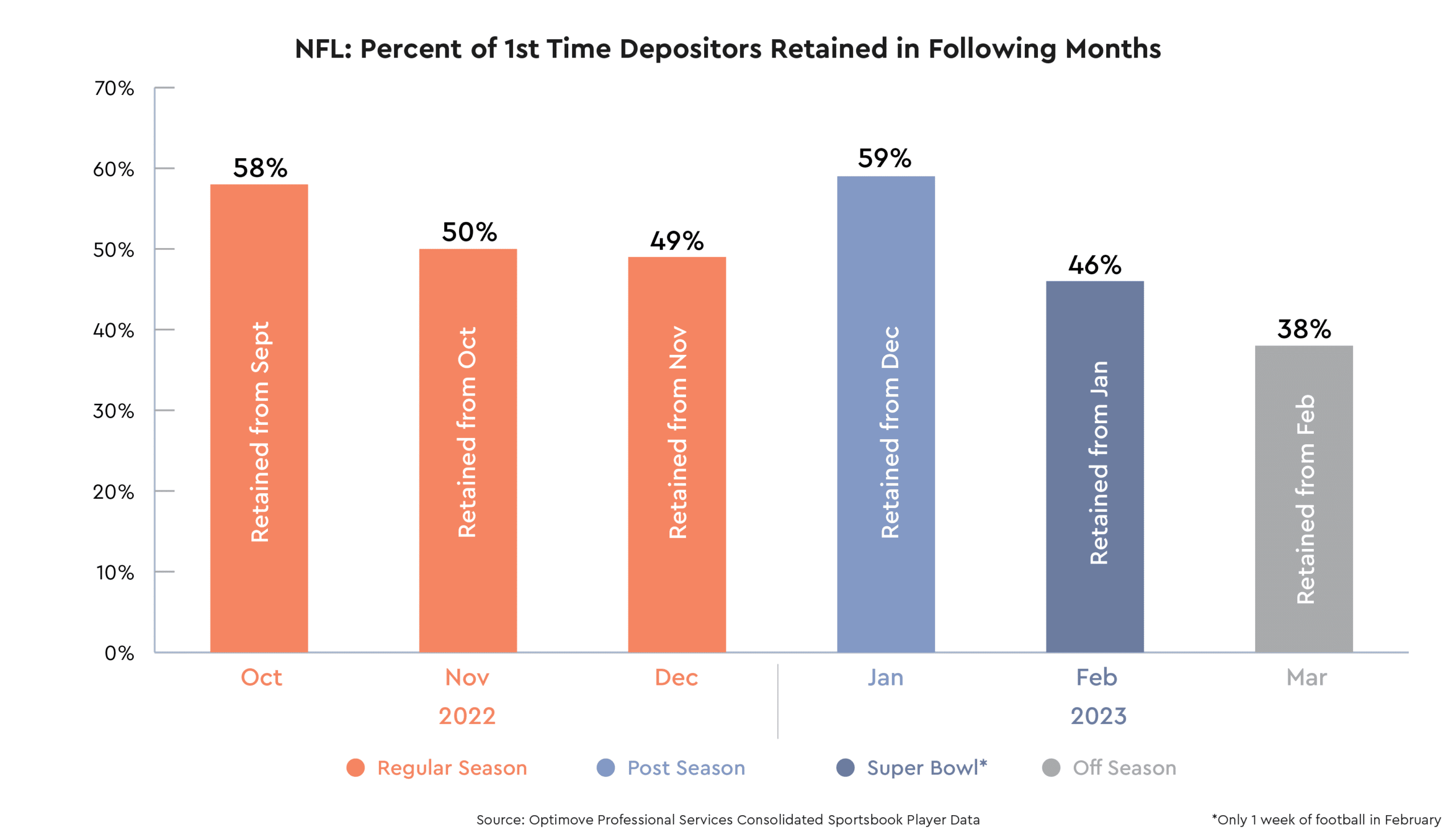 Nuestros Datos consolidados de jugadores de apuestas deportivas de Optimove Insights también revelaron que la tasa de retención de los depositantes por primera vez disminuyó al mes siguiente durante la temporada regular, con un pico de retención en enero, el mes de las eliminatorias. De los depositantes por primera vez en septiembre, el cincuenta y ocho por ciento (58 %) se mantuvieron activos en octubre. En noviembre y diciembre, aproximadamente la mitad se mantuvieron activos con respecto al mes anterior. En enero (mes de los playoffs), el 59 % de los nuevos depositantes se mantuvieron activos con respecto a diciembre, y en febrero, el 46 % se mantuvieron con respecto a enero. En marzo, el 38 % se mantuvieron con respecto a febrero, incluso cuando terminó la temporada de la NFL, lo que indica que los operadores encontraron nuevos juegos para atraer a los apostantes, quizás la March Madness. (véase el gráfico siguiente)