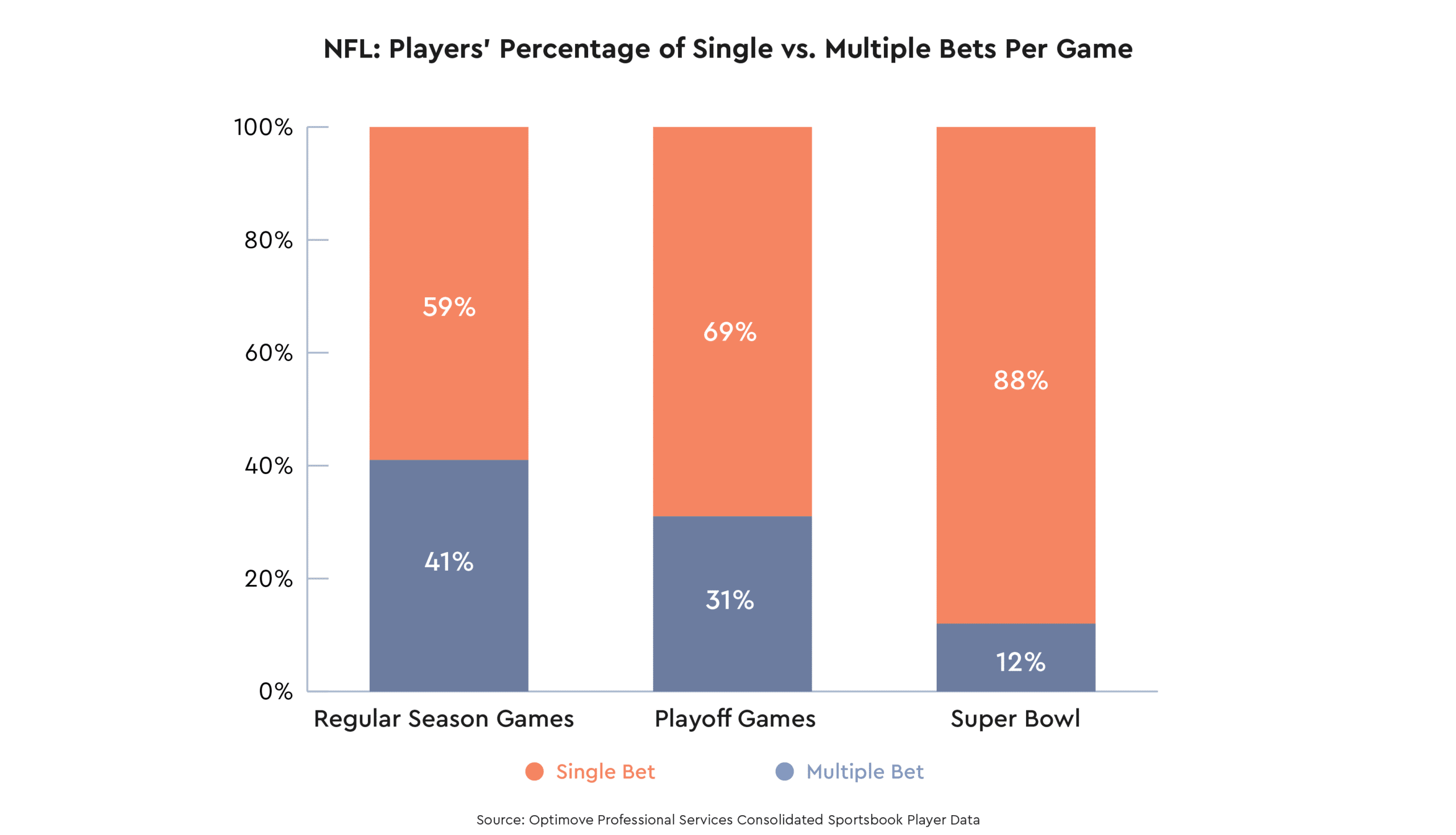En cuanto a las preferencias de apuestas, nuestros datos indican que los jugadores tienden a favorecer las apuestas simples, y esta tendencia aumenta a medida que se acerca la Super Bowl. Esta tendencia refleja el deseo de los jugadores de simplicidad y su preferencia por las apuestas directas, a medida que más jugadores nuevos se involucran en las apuestas deportivas de la NFL.