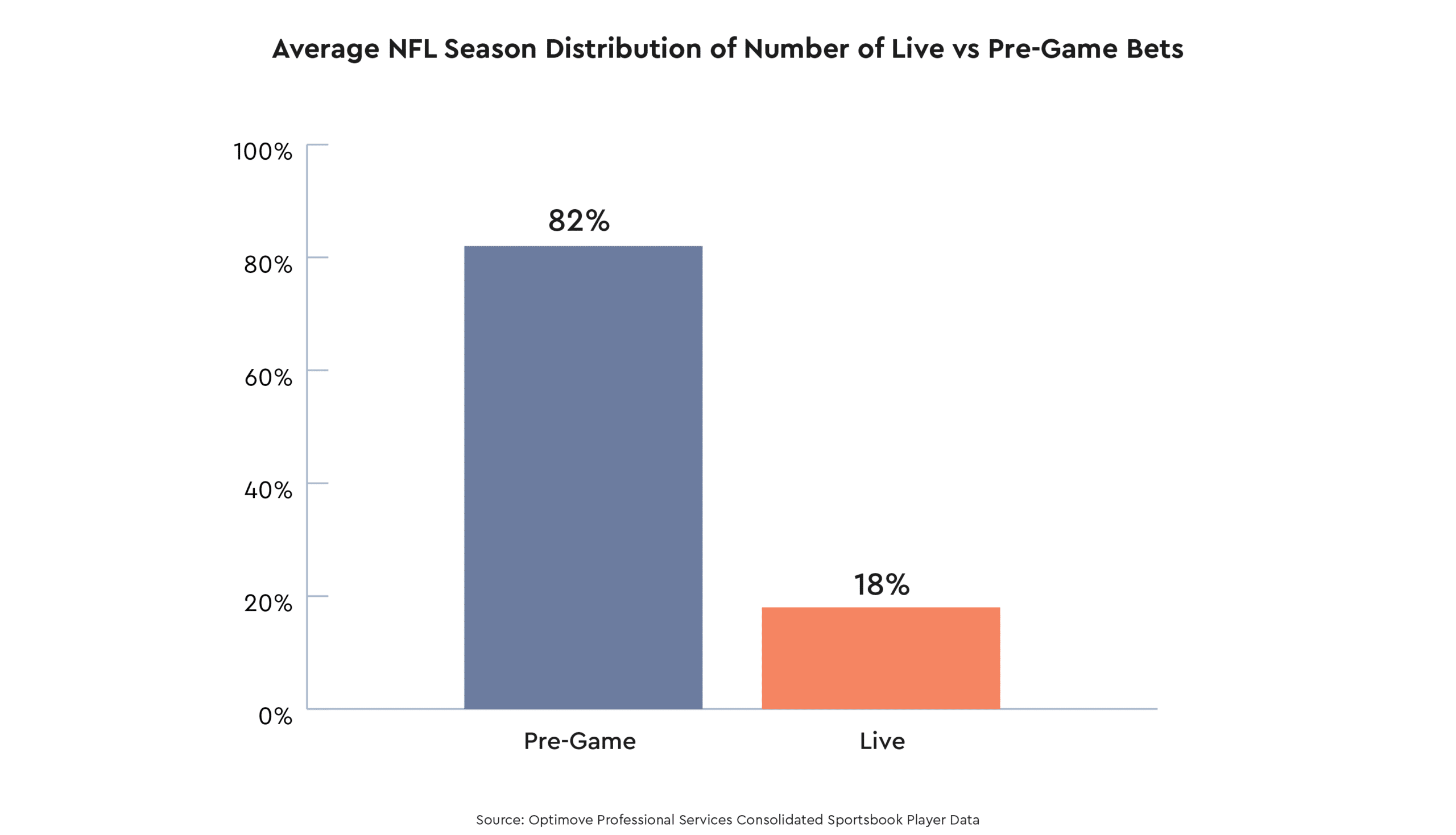 Las apuestas en directo, mientras se desarrolla el partido, son un aspecto importante de las apuestas deportivas, y nuestro análisis reveló algunos patrones interesantes. Descubrimos que el 82 % de los jugadores prefería realizar sus apuestas antes del partido a lo largo de la temporada, lo que deja solo un 18 % realizando apuestas en directo. Sin embargo, el importe medio de las apuestas en directo era 1,6 veces superior al de las apuestas antes del partido, lo que indica que los jugadores más experimentados realizan estas apuestas más altas.