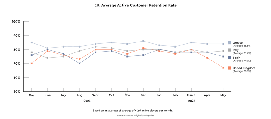 En mayo de 2025, la retención de jugadores activos en el Reino Unido cayó drásticamente hasta el 66,9 %, frente a la media de los últimos 12 meses, que era del 77 %. Esto supone la tasa de retención mensual más baja del último año.
