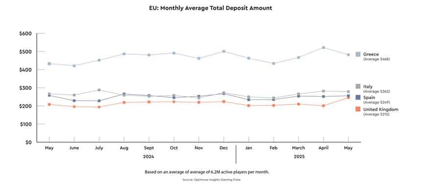 El informe Pulse de mayo de 2025 examina los juegos de azar en línea en el Reino Unido y compara a los jugadores británicos con otros 6,2 millones de jugadores de toda Europa. En mayo, el Reino Unido registró menos depósitos y apuestas que otros países, pero los hábitos de los jugadores comenzaron a cambiar, probablemente debido a los cambios normativos.