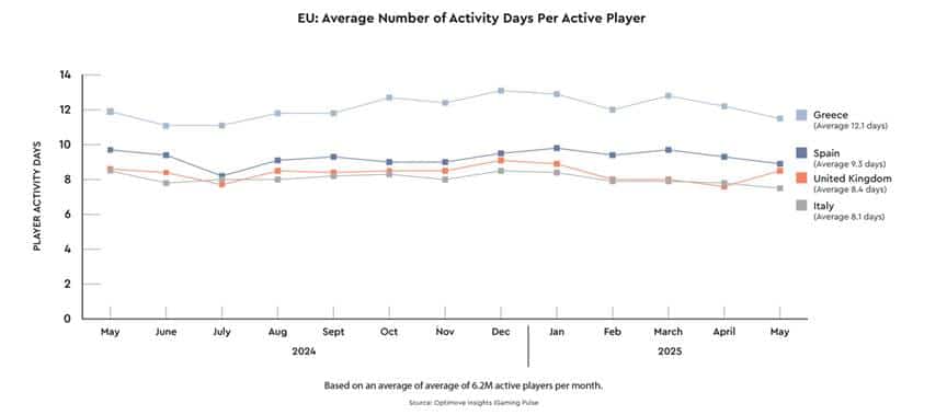 El mes de mayo también registró un ligero aumento en el compromiso. El promedio de días de actividad por jugador activo en el Reino Unido aumentó de 8,4 a 8,5, un aumento modesto, pero una señal de que los jugadores retenidos están participando con más frecuencia en el nuevo panorama normativo.