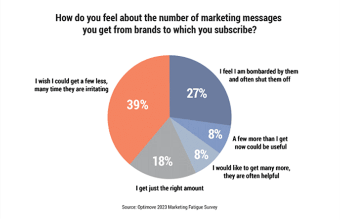 A Pesquisa sobre Fadiga do Marketing de Consumo 2023 da Optimove mostra que os profissionais de marketing tendem a ser mais invasivos do que úteis ao interagir com os consumidores. A pesquisa foi realizada em janeiro de 2023 com 450 consumidores dos EUA. Com base no gráfico abaixo, os profissionais de marketing devem ter em mente que, às vezes, menos é mais.
