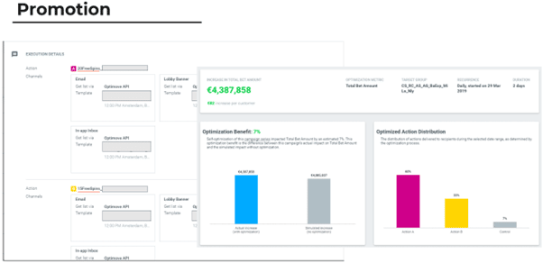 A IA da Optimove aprende os comportamentos dos seus clientes a partir de cada campanha individual em tempo real e ajusta-os de acordo. Isso também significa que os profissionais de marketing podem testar campanhas e criativos uns contra os outros, decidindo continuamente o que é enviado a cada cliente – para maximizar o aumento.
