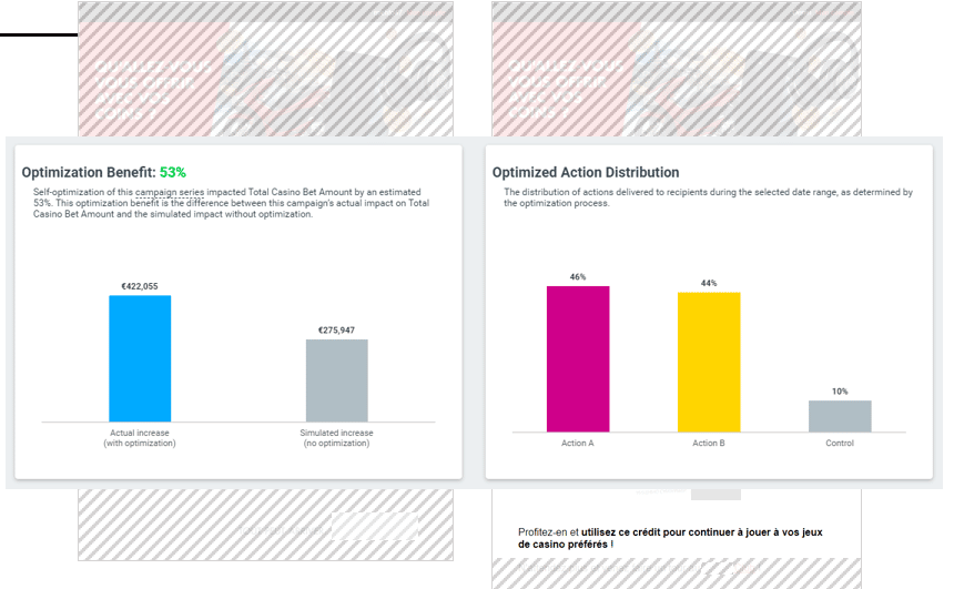 A operadora observou um aumento estimado de 53% no valor total das apostas no casino. Este aumento é a diferença entre o impacto real desta campanha nos montantes totais das apostas no casino e o valor que teriam gerado se tivessem enviado um simples teste A/B.