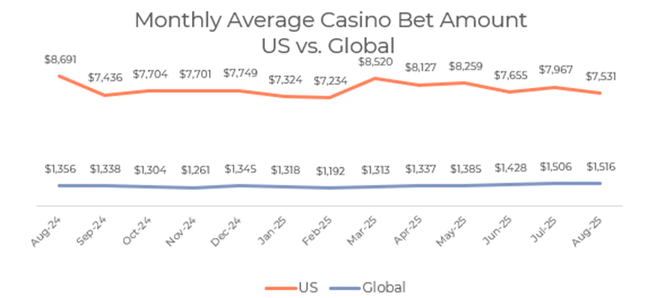 O mercado dos EUA demonstrou força e desaceleração sazonal em agosto. O número de apostadores desportivos aumentou 17% em relação ao ano anterior, mas o gasto médio mensal por apostador diminuiu de US$ 1.013 em agosto de 2024 para US$ 990 em agosto de 2025, uma queda de 2,3%. A atividade dos casinos seguiu um padrão semelhante. O número de jogadores ativos cresceu 24%, mas o seu gasto médio diminuiu de US$ 8.691 para US$ 7.531, refletindo uma queda de 13,3%.