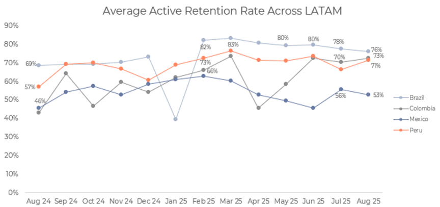 Na LATAM, os dados de agosto mostraram um mercado em constante amadurecimento. O Brasil manteve a sua posição de líder em envolvimento e retenção, com jogadores ativos em média 12,1 dias e retenção mantida em 76%. O México continuou a liderar tanto em depósitos como em valores de apostas desportivas, enquanto o Peru dominou no desempenho dos casinos. A Colômbia apresentou melhorias graduais no envolvimento e retenção, apesar de uma ligeira diminuição nos gastos com casinos. Esses padrões ilustram como as reformas regulatórias e a maturidade do mercado criam consistência e fortalecem as bases para um crescimento sustentável em toda a região.