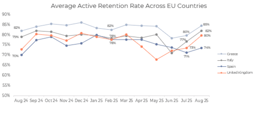 Em toda a União Europeia, a Grécia manteve a sua liderança, superando em depósitos, apostas desportivas e retenção com uns impressionantes 85%. A Espanha mostrou força na atividade de casino e começou a recuperar tanto no envolvimento como na retenção após quedas anteriores.
