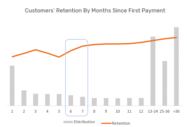 O gráfico abaixo, baseado na análise de dados realizada com os clientes da Optimove, demonstra a distribuição dos clientes por meses após o primeiro pagamento e a sua taxa de retenção (a probabilidade desses clientes continuarem a ser clientes pagantes no mês seguinte). Neste gráfico, seis meses após o primeiro pagamento, há uma tendência moderada de aumento da taxa de retenção do cliente. Podemos então concluir que, após seis meses, um cliente pode ser elegível para o estatuto VIP.