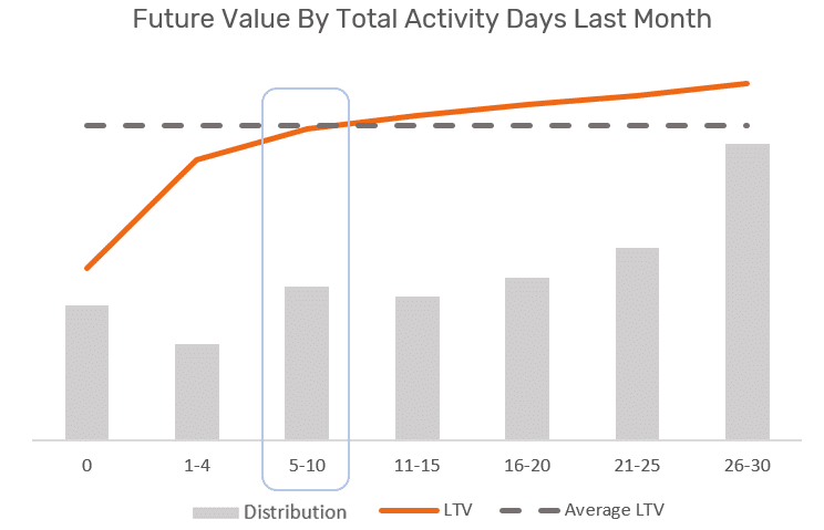Outro fator que pode ser levado em consideração ao definir VIPs não monetários é a utilização do cliente. A demonstração abaixo mostra o valor ao longo da vida (LTV) do cliente por dias de atividade mensais e o LTV médio. Os clientes com mais de 5 a 10 dias de atividade mensal têm um LTV superior ao LTV médio, o que pode ser um bom limite para VIPs.