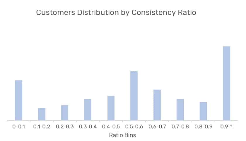 Calculei a taxa de consistência para cada cliente dividindo os meses em que o cliente esteve ativo pelo número total de meses pagos (entre os utilizadores com mais de 6 meses desde o seu primeiro pagamento).