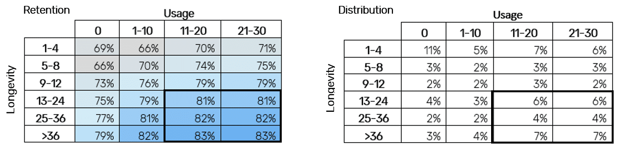 Se definirmos os VIPs por um KPI, veremos um grande grupo de clientes, mas ao usar a combinação de uso e longevidade, bem como outras combinações, podemos gerar um pequeno grupo de clientes de topo (também conhecidos como nossos VIPs). Abaixo, combinamos essas categorias e a retenção de cada cliente. Como podemos ver, os clientes com o maior número de dias de atividade mensal e a longevidade mais prolongada têm a maior probabilidade de pagar no mês seguinte. Por exemplo, os clientes com mais de um ano representam cerca de 50% de todos os clientes, mas com a combinação de utilização de mais de 10 dias de atividade, resultará num grupo de cerca de 30% com uma alta taxa de retenção que pode potencialmente ser clientes VIP. Também é possível combinar mais categorias para reduzir o tamanho do grupo.