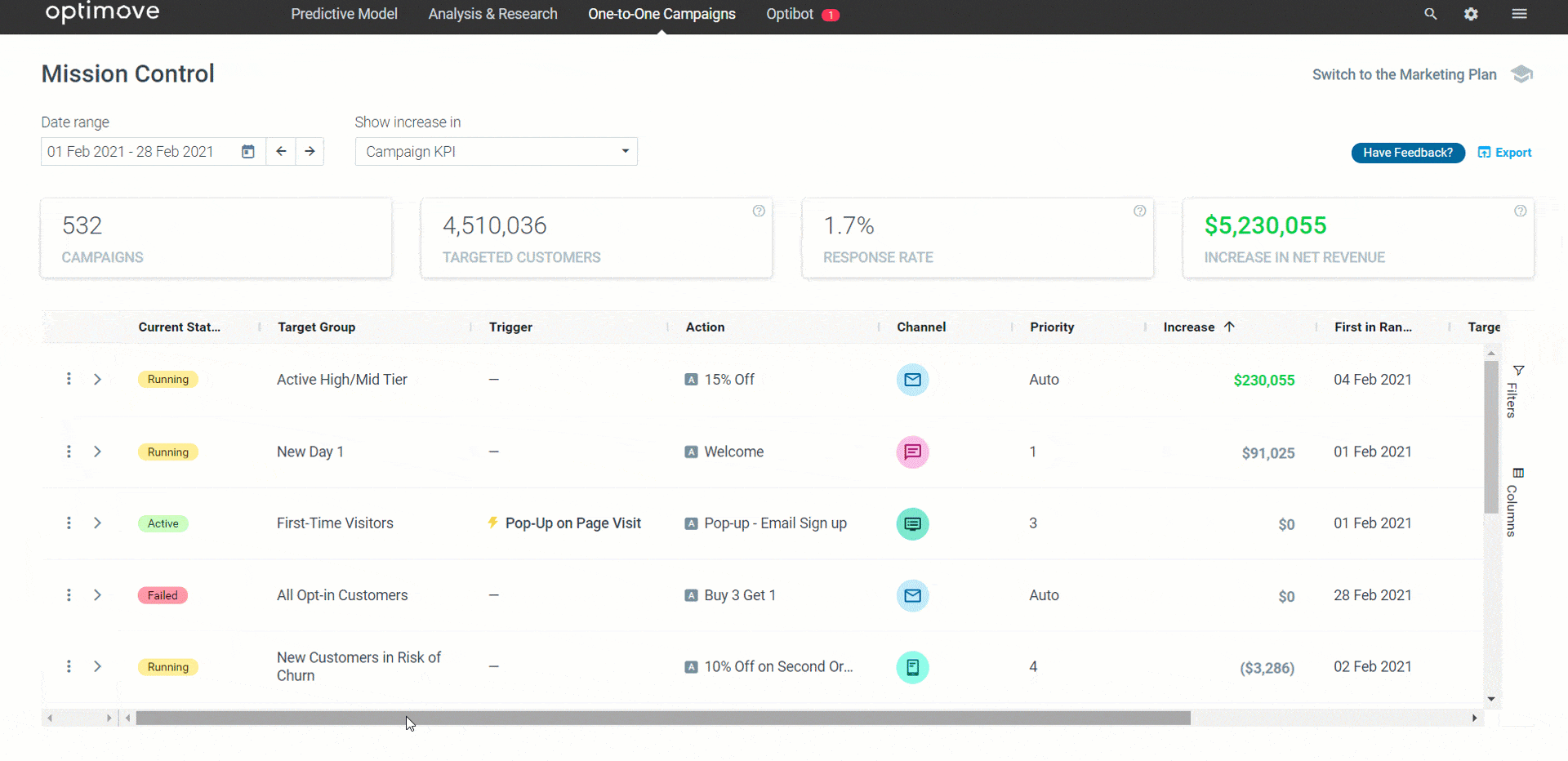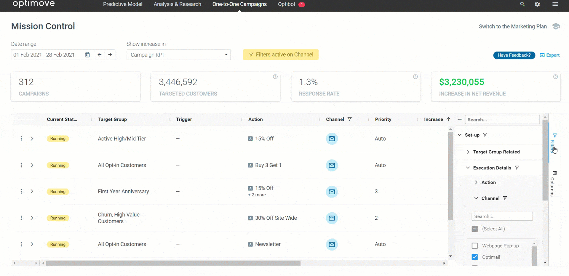 Embora esse desafio possa parecer assustador, para apoiar a sua escala em personalização, a Optimove lançou o Mission Control, uma visão única que agrega dados sobre todas as suas campanhas de marketing em todos os canais, capacitando-o a realizar campanhas de marketing personalizadas e eficazes. Ao dividir, agrupar e filtrar, você obtém acesso fácil a qualquer informação necessária sobre as suas campanhas a qualquer momento.