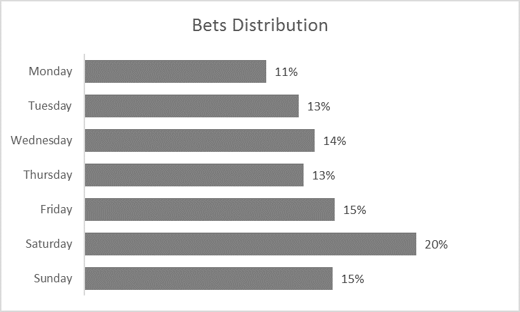 20% das apostas são feitas aos sábados. Sexta-feira e domingo têm a segunda e terceira maiores distribuições de apostas (ambas com 15%), e esses três dias são responsáveis por 50% do total de apostas feitas.
