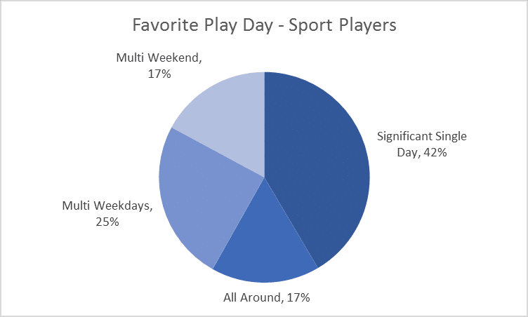 Como mostra o gráfico circular, 42% dos jogadores têm um dia específico em que tendem a visitar a marca com mais frequência. O que é surpreendente é que 25% dos jogadores não têm um dia favorito significativo, mas jogam mais durante a semana.