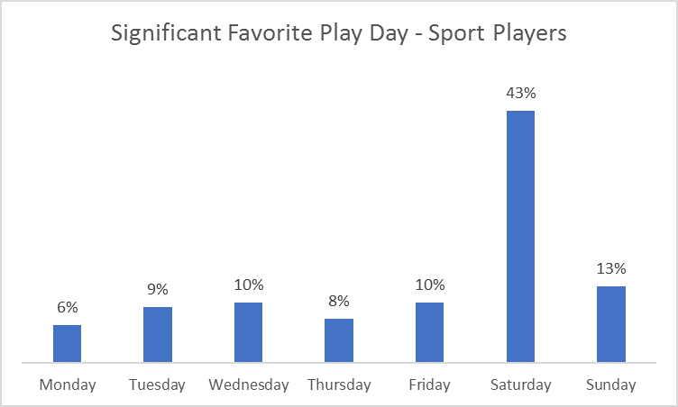 Dos 42% dos clientes com um único dia favorito para apostar, 43% preferem o sábado como dia favorito (18% da população, 43% de 42%). Além disso, 10% apostam principalmente às sextas-feiras (4,2% da população) e 13% apostam principalmente aos domingos (5,4% da população). A soma de todos os jogadores que preferem apostar durante os fins de semana, múltiplas ou únicas, totaliza 44,6% da população. Considerando que os fins de semana são os dias mais populares em geral, adicionaremos os jogadores «versáteis», que têm um dia favorito desconhecido para apostar, a essa população e chegaremos a quase 62%.