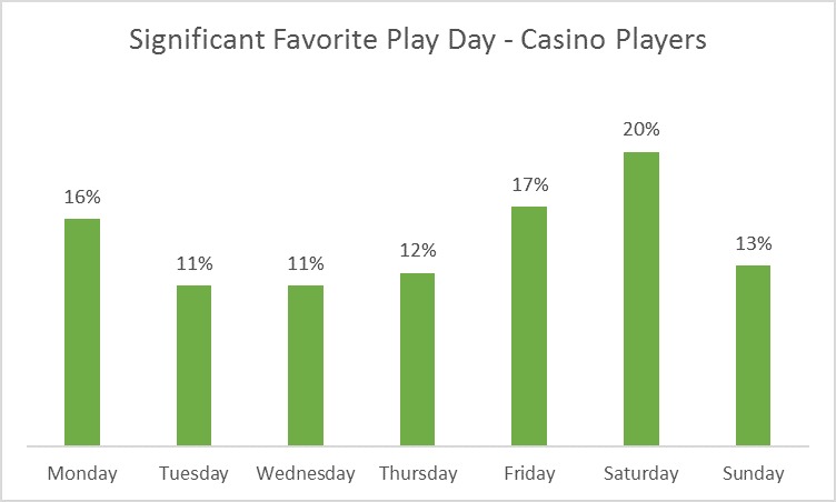 O momento de comunicação inadequado não é exclusivo da indústria de apostas desportivas. Muitos profissionais de marketing compartilham o mesmo problema em termos de segmentação. Os operadores de cassinos online adoram suas ofertas semanais, que se repetem para todos os jogadores no mesmo dia da semana. Ao criar a mesma análise para jogadores britânicos com base nos dias de jogos de casino, encontramos uma tendência ainda mais estranha para jogadores com um dia de jogo de casino favorito significativo (45% dos jogadores):