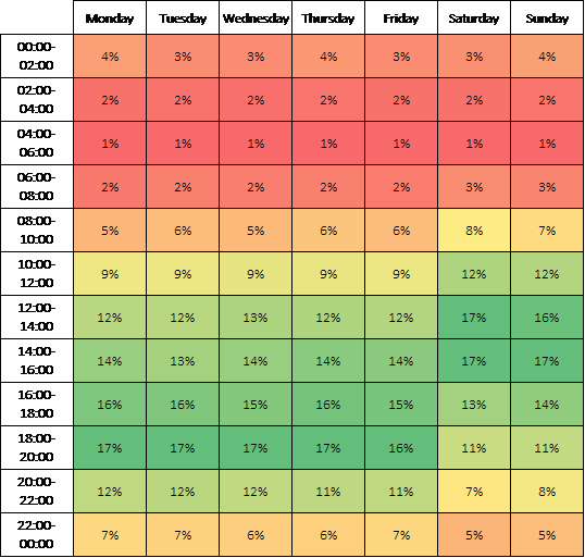 Em termos de tempo, temos muitas suposições baseadas no comportamento plural – estamos a enviar a maioria das nossas comunicações ao mesmo tempo do dia, assumindo que todos os clientes abrirão os nossos e-mails ou interagirão com as nossas SMS ao mesmo tempo. Na matriz abaixo, pode encontrar a distribuição de apostas para o mesmo grupo de jogadores britânicos com o qual começámos, combinando dias e horas.