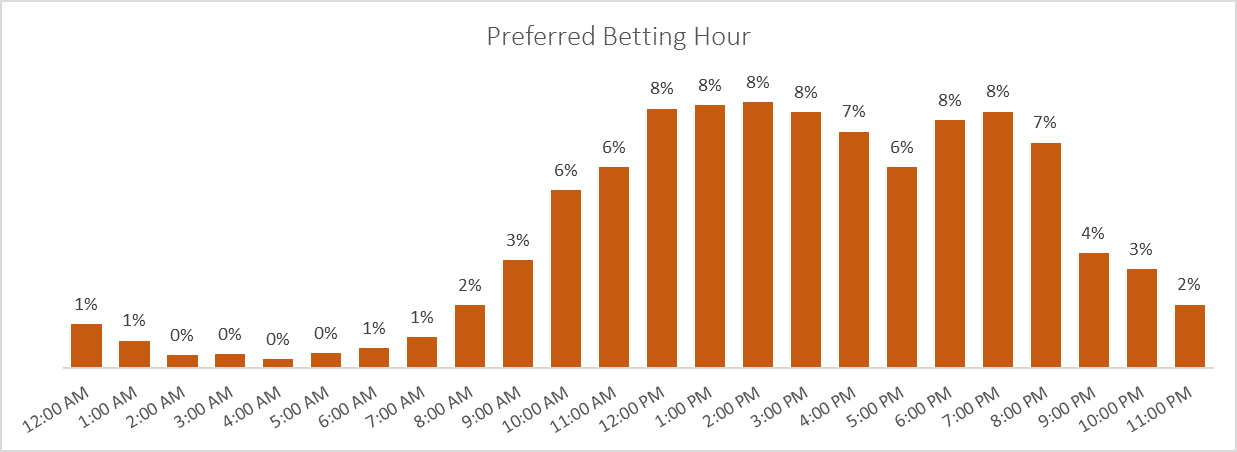 Ao descobrir a distribuição do horário preferido, verificamos que é quase unificado entre as 10h e as 20h – (é aquele velho gráfico em forma de baleia que provavelmente conhece de testes semelhantes). Neste caso, qual é o momento certo para comunicar com estes apostadores?