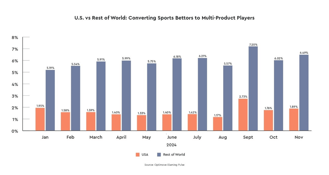Globalmente, uma média de 6% dos jogadores transitam para utilizadores de vários produtos todos os meses, envolvendo-se com ofertas de casino e desportivas. Nos EUA, no entanto, este número fica significativamente aquém, com apenas 2% dos apostadores desportivos a fazer a transição para jogadores múltiplos. Este desempenho abaixo do esperado destaca uma oportunidade perdida para aprofundar o envolvimento dos jogadores e impulsionar a retenção.