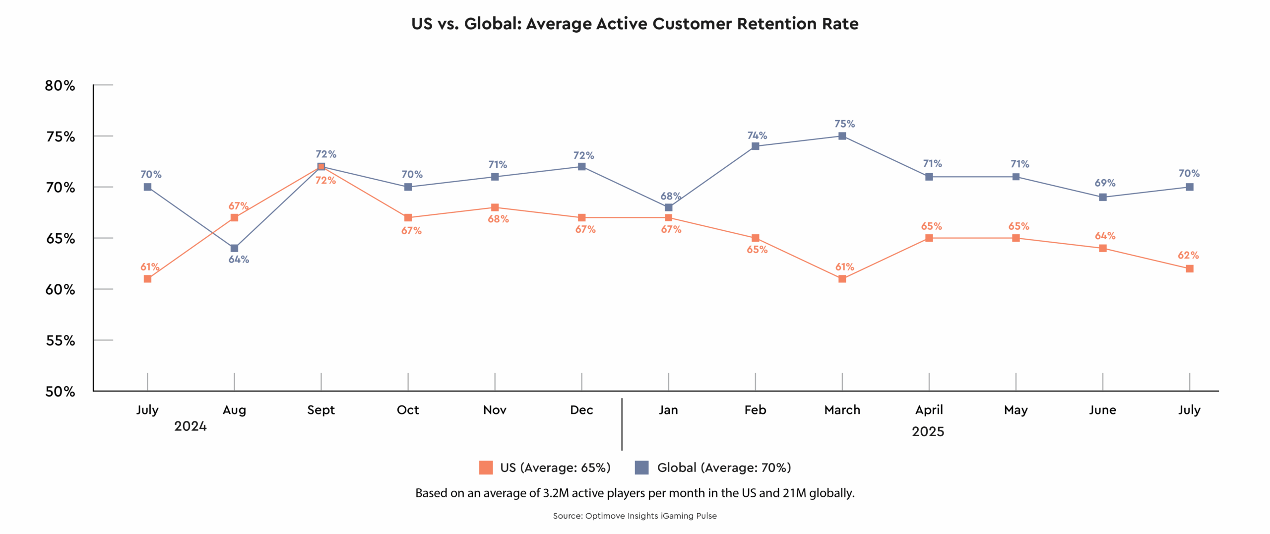 Esta diferença na retenção sugere que, embora os jogadores dos EUA depositem mais, conforme relatado no resumo do iGaming Pulse de junho, os operadores podem precisar ajustar as estratégias de retenção para acompanhar os padrões globais.