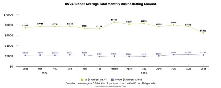 Os dados revelam uma enorme disparidade nos gastos com cassinos, com os jogadores dos EUA apostando valores maiores em comparação com seus colegas globais. A média de 12 meses para um jogador dos EUA é de US$ 7.674, enquanto a média global é de US$ 2.105.