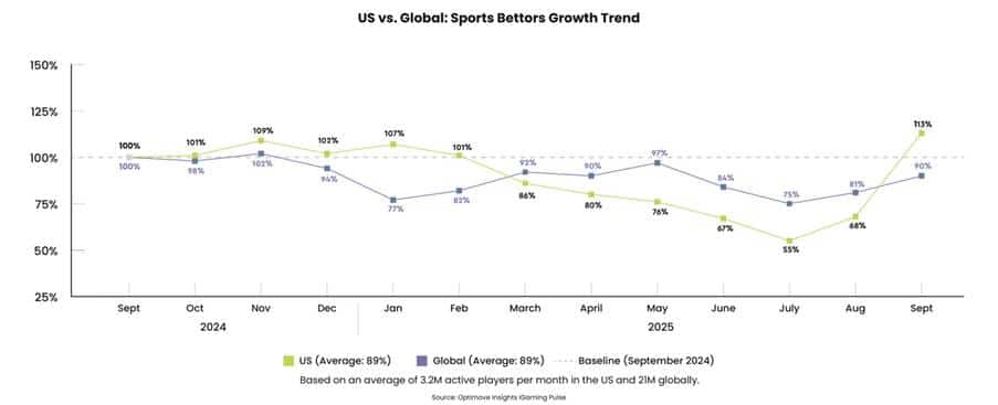 Ao contrário da tendência de crescimento do casino, as apostas desportivas parecem estar a perder força. A tendência de crescimento nos EUA registou uma queda significativa no número de jogadores desde fevereiro de 2025, atingindo um mínimo de 55% em julho, enquanto a tendência global mostrou mais flutuações ao longo do ano, sempre abaixo da linha de base.