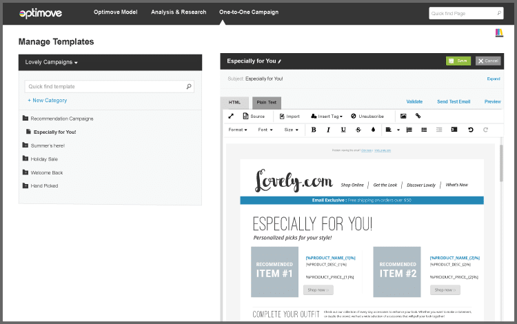 As recomendações de produtos geradas pela Optimove ajudam a expor os clientes a produtos e categorias de produtos que eles ainda não exploraram, mas que provavelmente acharão atraentes. Combinadas com a segmentação avançada de clientes da Optimove, as campanhas de recomendação de produtos permitem a criação de comunicações hiperdirecionadas que são ainda mais personalizadas para cada cliente individual. Por exemplo: uma campanha direcionada a quem procura promoções será muito mais eficaz se apresentar não apenas a oferta geral, mas também produtos específicos nos quais cada cliente possa estar interessado e seus preços com desconto. Essa camada adicional de personalização tem o potencial de conquistar até mesmo os clientes mais distantes do seu banco de dados.