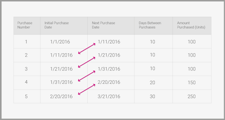 Um cliente fez 5 compras do mesmo produto em dias diferentes. Cada vez que ele ou ela comprou uma quantidade diferente do produto. Listaremos as datas em que as compras foram feitas e as datas das compras seguintes para calcular os dias entre as compras. Adicionaremos também a quantidade comprada na compra inicial (de cada linha). A quantidade, neste caso, pode ser traduzida em número de unidades por embalagem, peso, valor (se afetar a taxa de consumo – por exemplo, um crédito de 10 dólares que duraria o dobro de um crédito de 5 dólares), etc.
