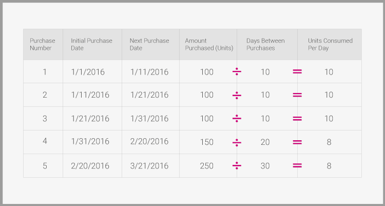 O próximo passo é dividir a quantidade comprada pelos dias entre as compras para obter a taxa de consumo - o número de unidades consumidas por dia. Neste exemplo simples, podemos ver que a taxa de consumo deste cliente é super estável. Ele ou ela consumiu inicialmente 10 unidades por dia e depois reduziu o consumo para 8 unidades por dia.