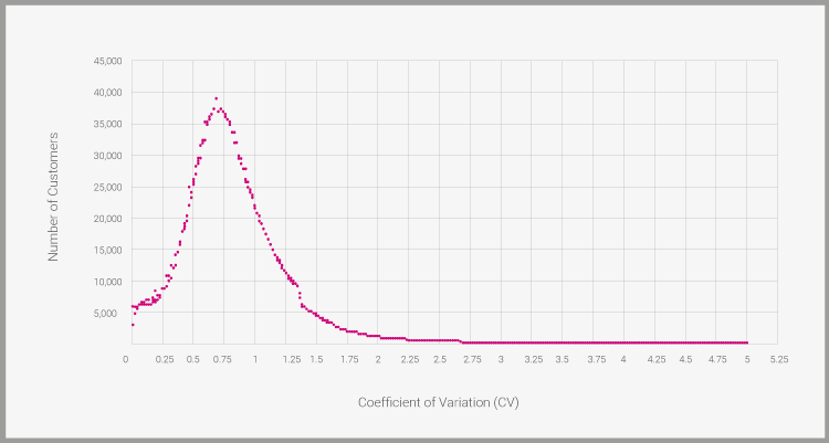Para cada cliente, calculamos o desvio padrão das unidades consumidas por dia (1,05 no exemplo acima) e dividimos pela taxa média de consumo de toda a base de clientes. Ao criar um gráfico de dispersão para todos os CV dos clientes, obtemos uma distribuição do CV na base de clientes. A distribuição pode ser semelhante a esta: