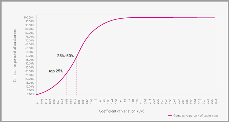 Para detetar esses clientes estáveis, utilizaremos uma medida chamada coeficiente de variação (CV), uma medida estatística para comparar séries de dados. Essa métrica nos ajudará a criar um limite para definir quem será considerado um cliente com um padrão de consumo estável (= CV baixo), para quem poderemos prever a próxima compra. Veja como: