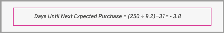 A metodologia para detetar quando os clientes com um padrão de compra estável deverão fazer a sua próxima compra é composta por alguns passos simples. Primeiro, precisamos de identificar o tempo entre as compras de um produto específico para cada cliente e a quantidade comprada em cada compra. Em seguida, descobrimos a taxa de consumo dividindo os dias entre as compras pela quantidade comprada. Agora temos todas as informações necessárias para prever quando o cliente deverá fazer a sua próxima compra e podemos aplicá-las numa fórmula.