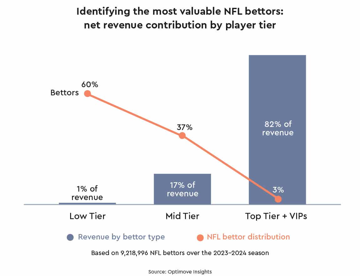 Optimove Insights' analysis of over 1.28 billion NFL bets from more than 9 million bettors during the 2023–2024 season shows that 3% of players generate 82% of the revenue for sportsbooks for big events like the Super Bowl. Conversely, 60% of bettors contribute only 1% of revenue, while the remaining 37% account for 17% of revenue.