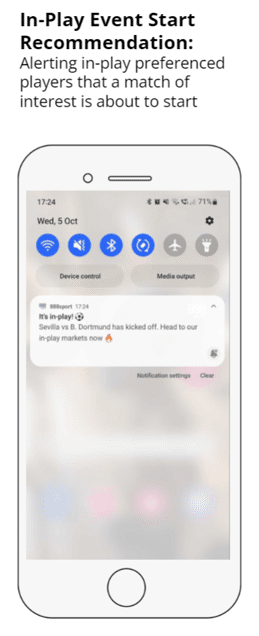 You can also send in-play event recommendations alerting players that a match of interest is about to start – for instance: