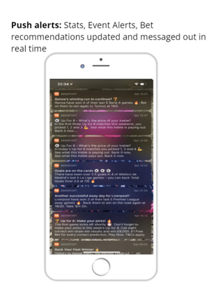 Here’s an example of Push alerts where a player is sent stats, event alerts, and bet recommendations directly to their phone. These alerts are updated and sent out in real-time.
