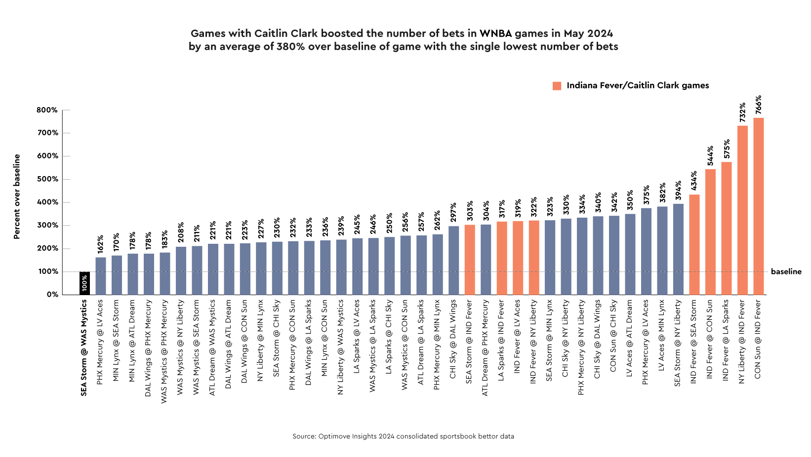 In May 2024, games featuring Caitlin Clark and her team, the Indiana Fever, saw an average betting increase of 380% compared to a baseline game. Optimove Insights analyzed over 15 million bets placed during the WNBA regular season in May. The baseline game, Seattle Storm vs. Washington Mystics, had the fewest bets and was set at 100%.