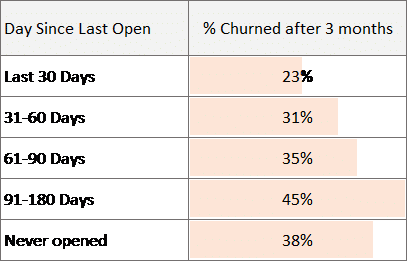 We can conclude that despite these customers who are not purchasing, opening emails is as predictive for remaining active as actual purchasing. Customers who cross the 30-day mark are 35% more likely to churn than customers who opened an email in the last month.