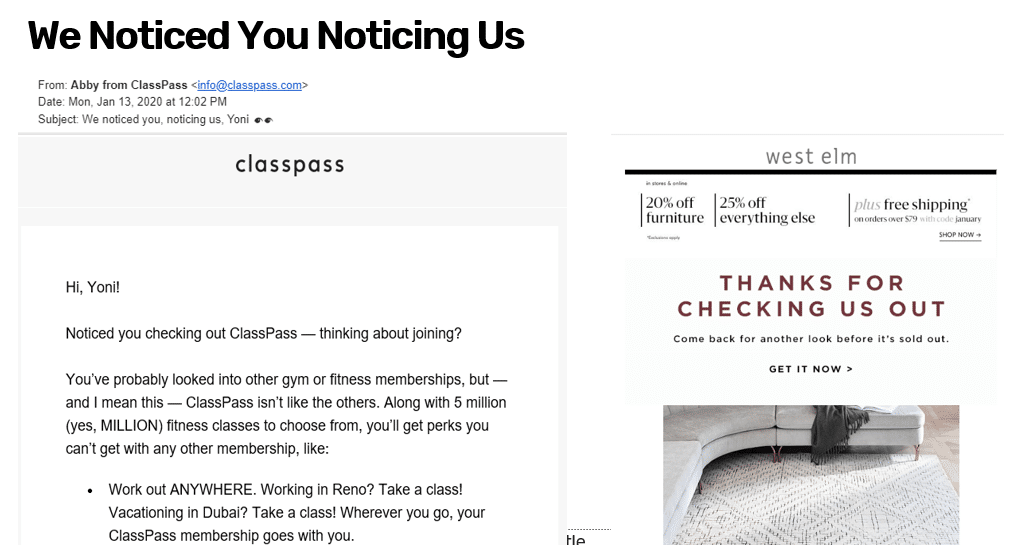 One way to address these types of customers and “give them a nudge” is to address their site visit with a “we noticed you noticing us” campaign. You can also try focusing the messaging of the campaign on encouragement to visit the site rather than on purchasing.