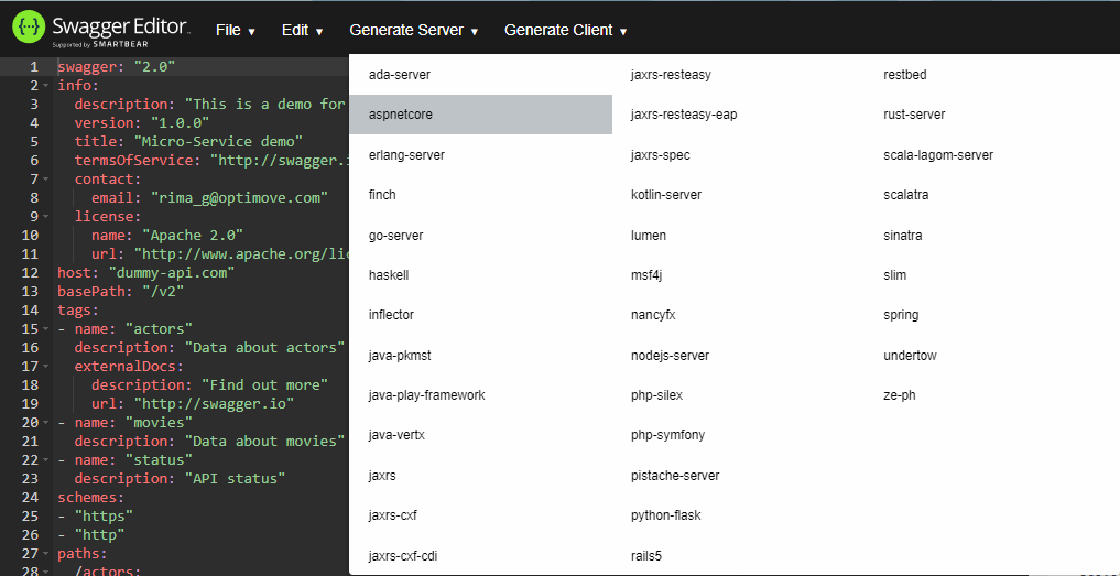 Let's start with creating a simple API generated from Swagger.Once you open a Swagger editor, there are several options: