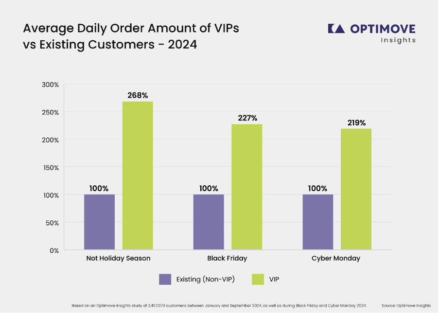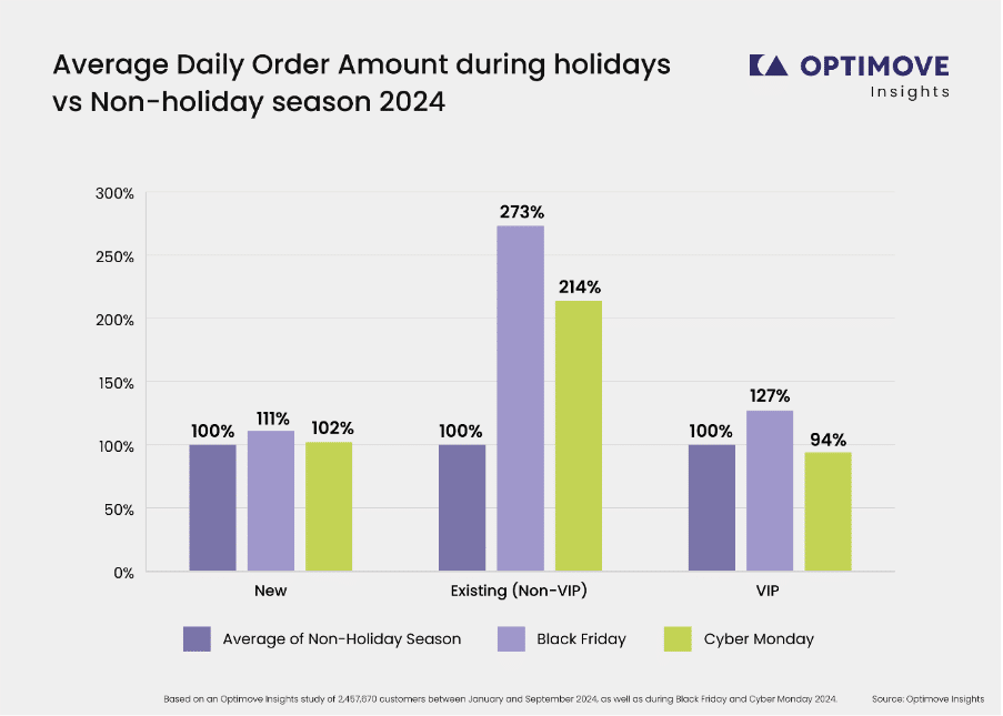 Although VIP customers continue to lead in overall order value, BFCM 2024 results reveal a clear shift in spending dynamics during the holiday period. On a regular day, VIP order amounts are typically 168% higher than those of non-VIP existing customers. During Black Friday and Cyber Monday, however, this gap narrows to 127% and 119%, respectively.