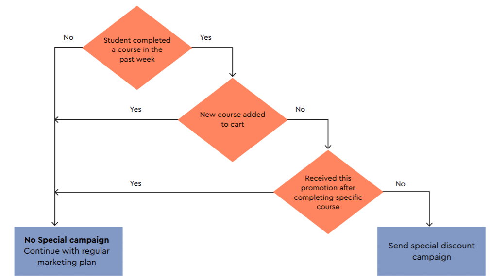 Using Optimove, you can quickly prioritize the messages sent to each student segment in situations where they can receive more than one communication at a time. Setting up orchestration rules can ensure that students receive the most appropriate communication while withholding big promotions from students who would have enrolled in another course regardless of a discount or promotion you would have otherwise offered. The flowchart below includes an example of orchestration rules that leverage student behavior to determine whether a promotion is required, or a different campaign should be sent. It takes into account the following: